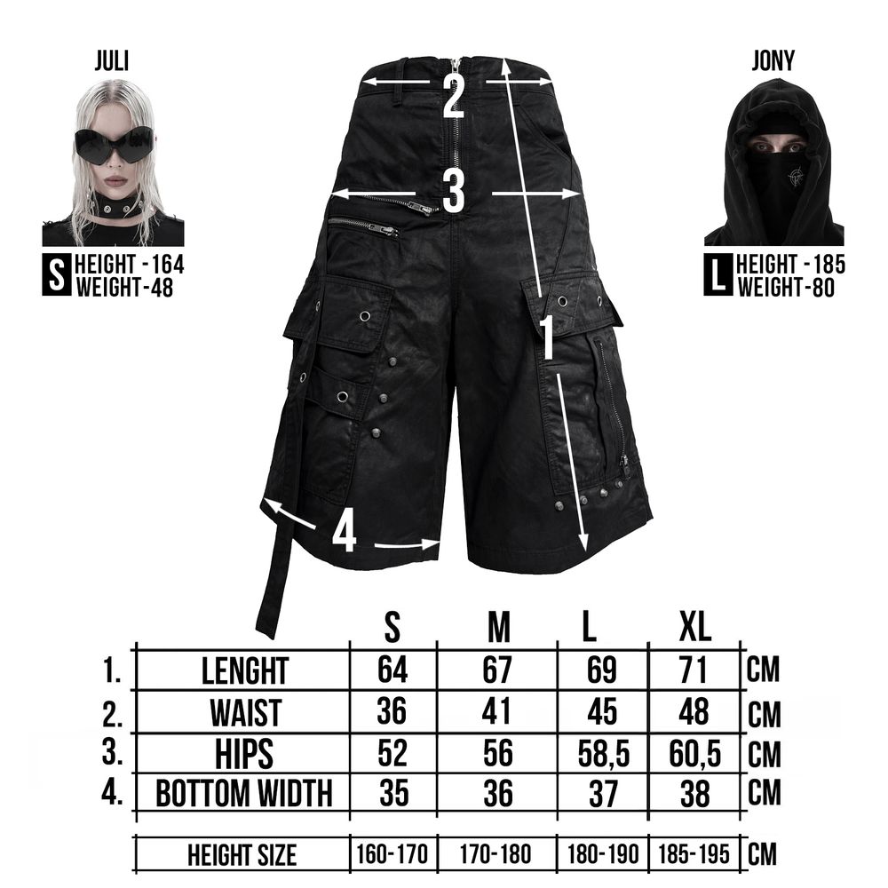 Помимо глянцевого воска, шорты имеют множество деталей. Два боковых кармана, декорированные металическими кольцами, молниями и болтами грязно-гранитного оттенка. Две перекрестные лямки, закреплённые в карманах. Две декоративные молнии над боковым карманом. Задний карман с вышивкой лого и лямкой с металическими кольцами. Каждая деталь, включая молнии, покрыты воском. Высококачественная фурнитура YKK.