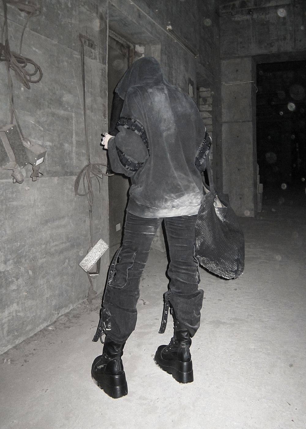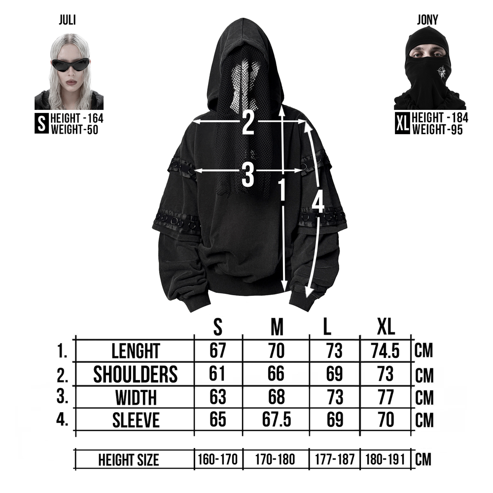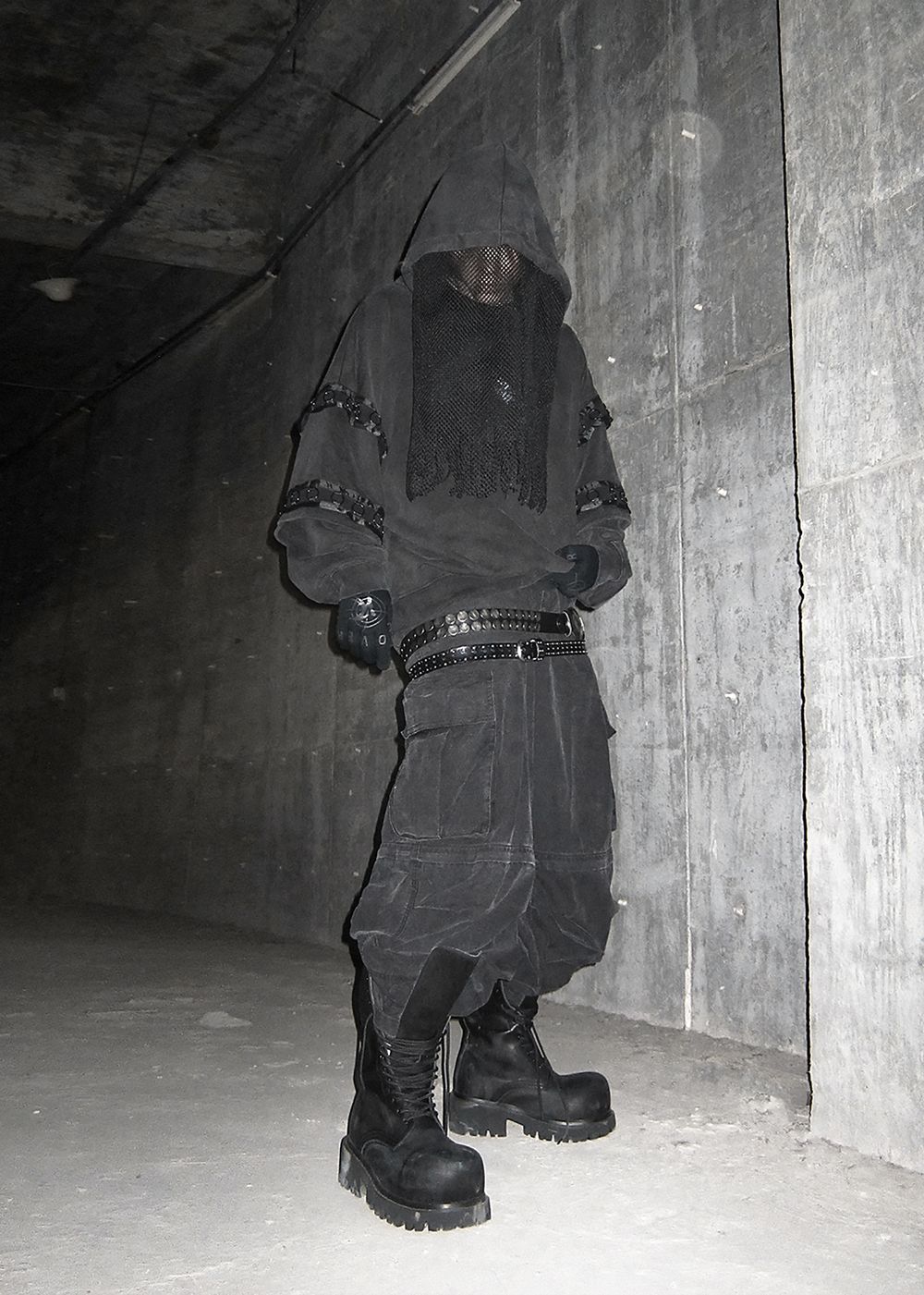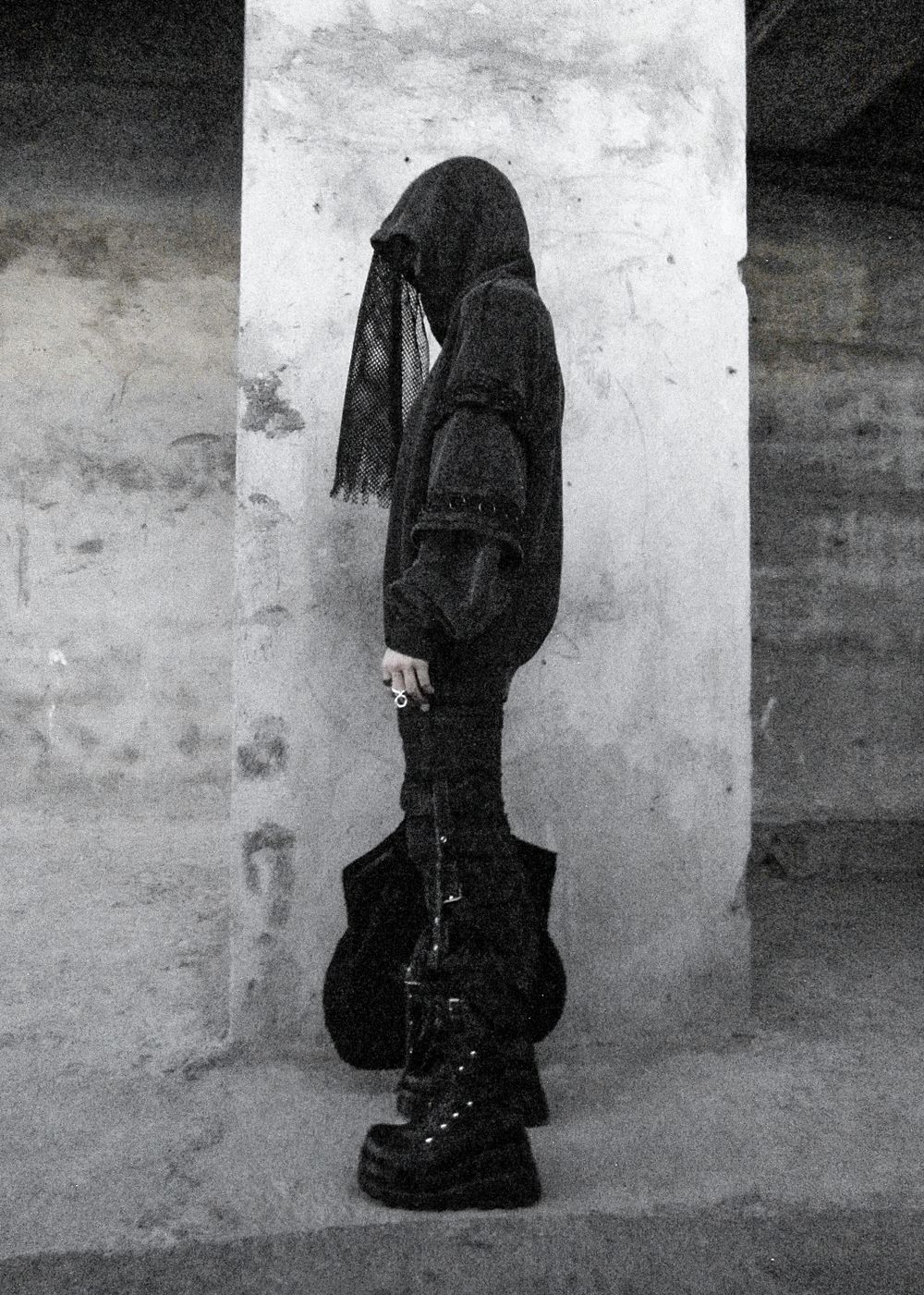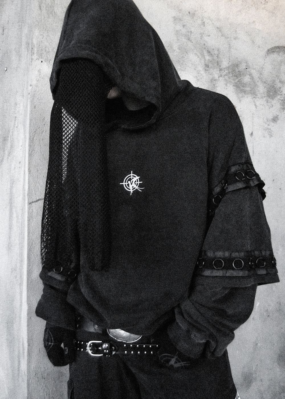 “HIVE” reflects the aesthetic of underground communities where faces are hidden, names don’t matter, and rules are whispered. The hoodie is inspired by sacred cult imagery: concealed identity, a heavy mantle, a symbol of belonging. The hive is a place where shadow replaces light — something dark, unified, and inexplicable.