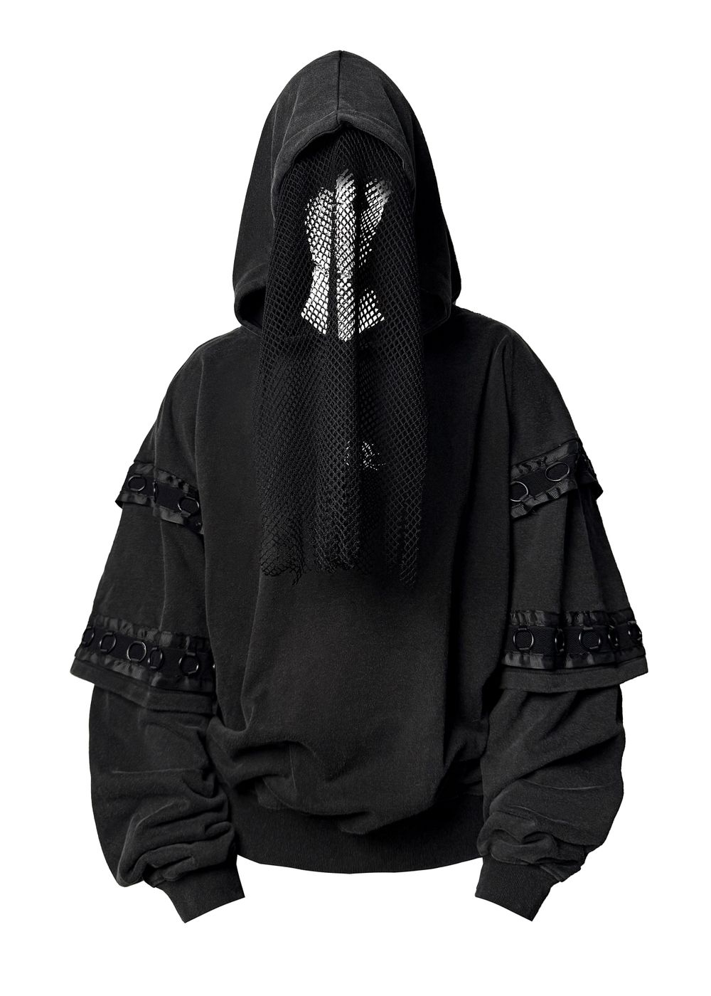 The key feature is the deep hood with an integrated mesh mask. It covers the face like a silk veil. The mesh is layered to conceal the face while maintaining clear visibility. The edges are intentionally “raw”. The mask can be tucked into the hood to reveal the face.