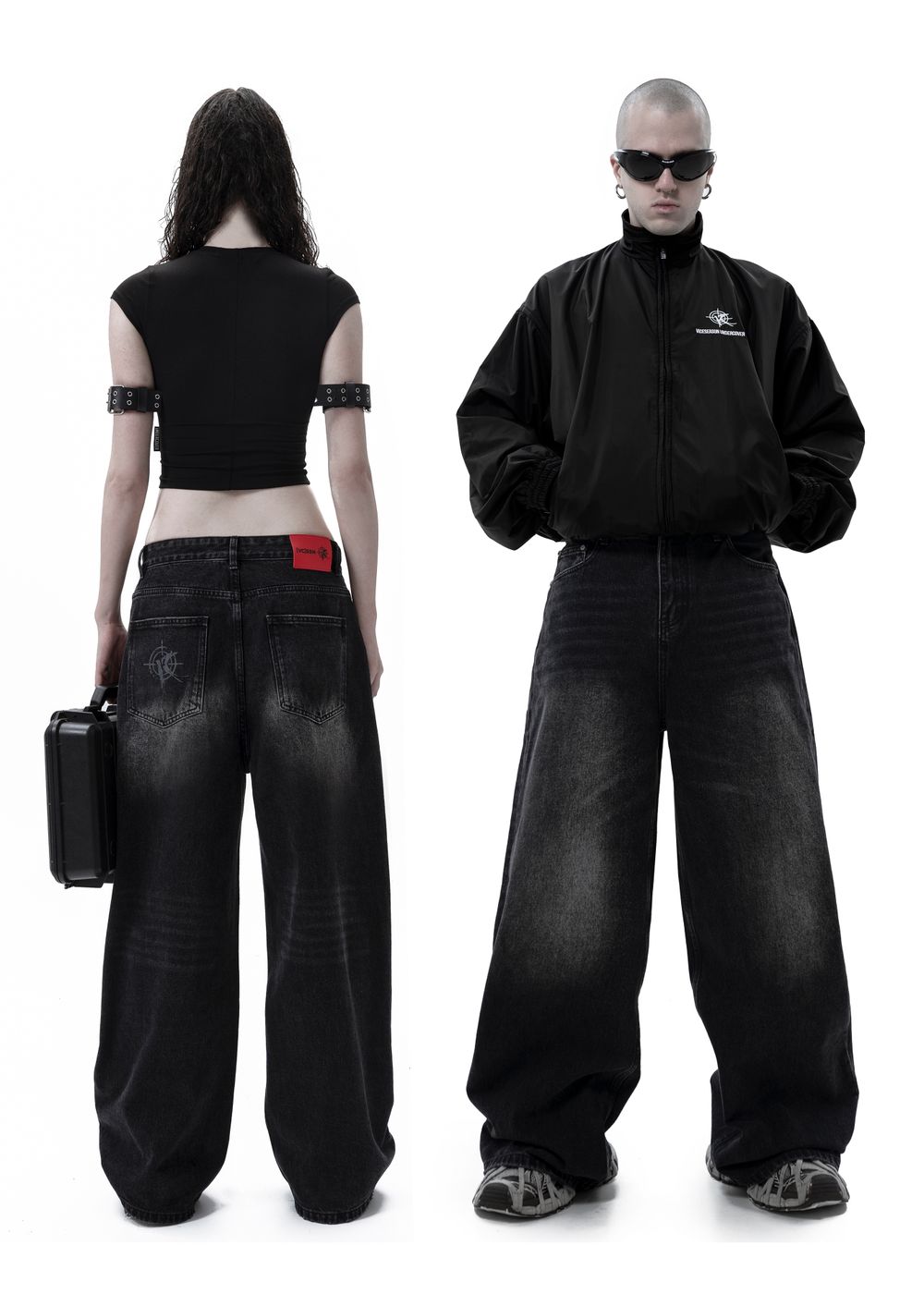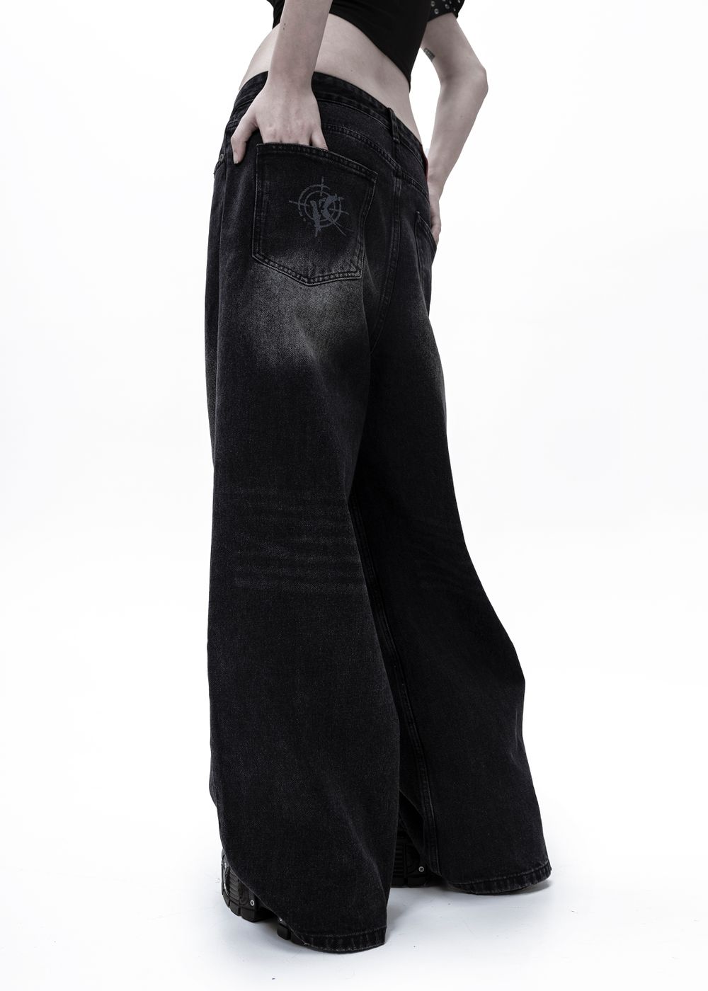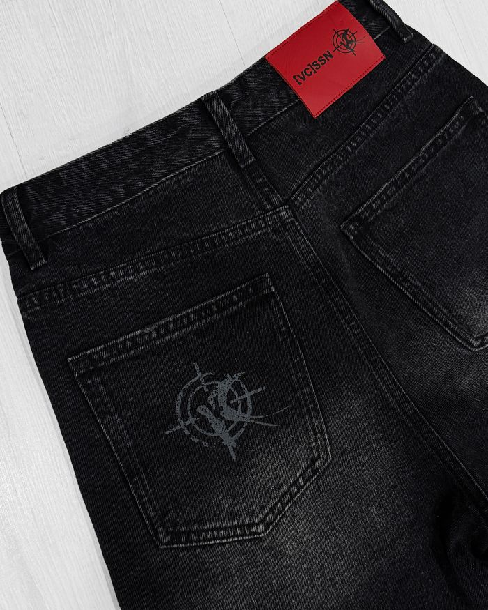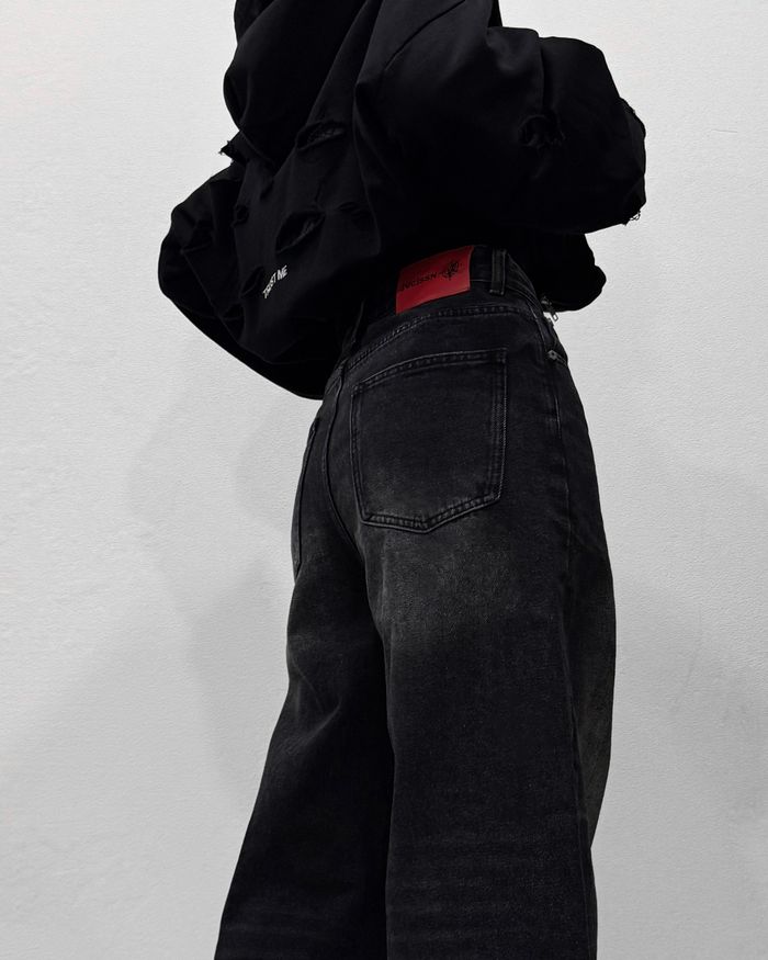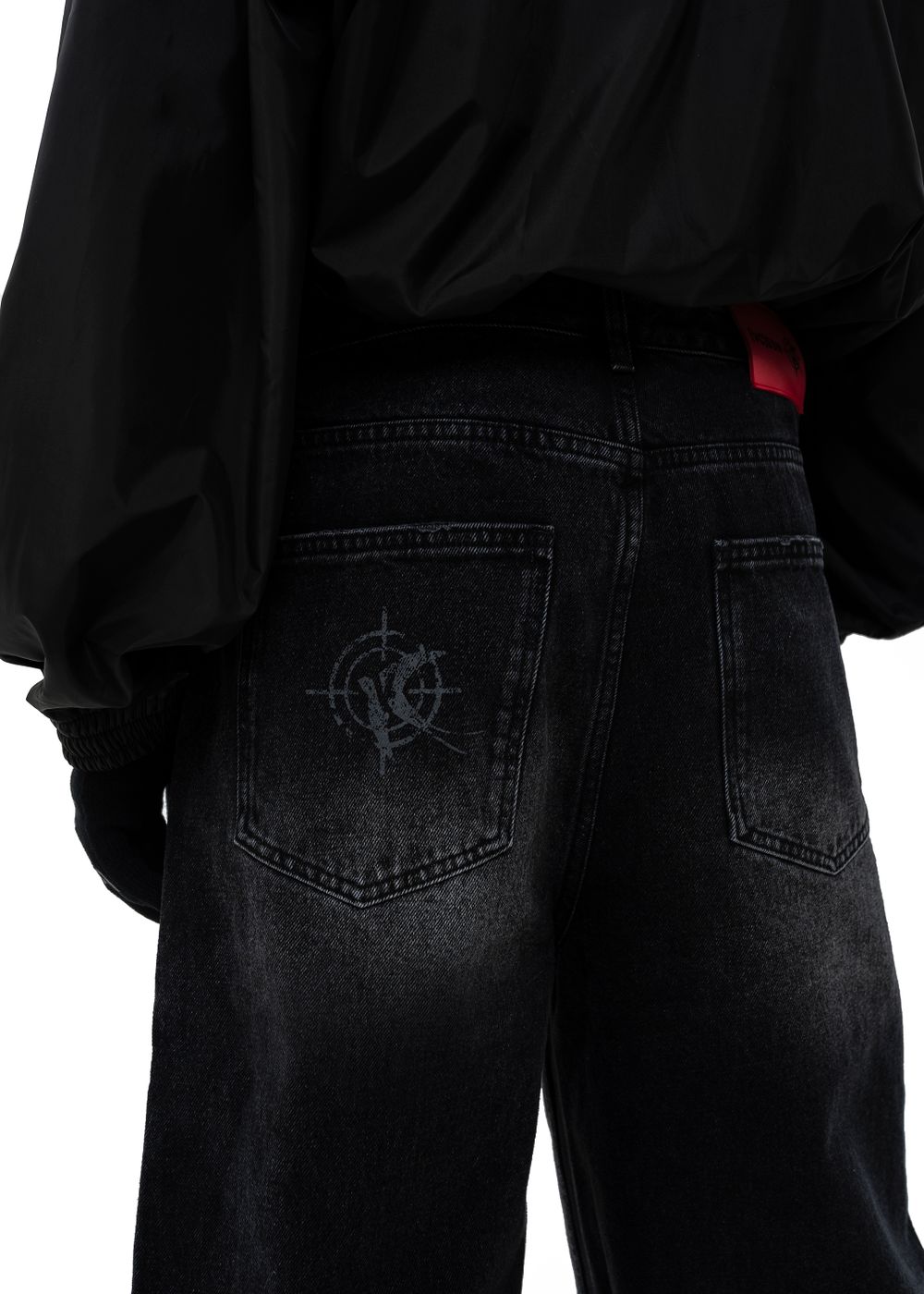 Straight oversized fit. Cracked logo print on the back pocket. Durable YKK zipper, branded iron button with engraved logo. Branded metal rivets reinforced along pocket seams. Leather jacron in a rich red color on the waistband.