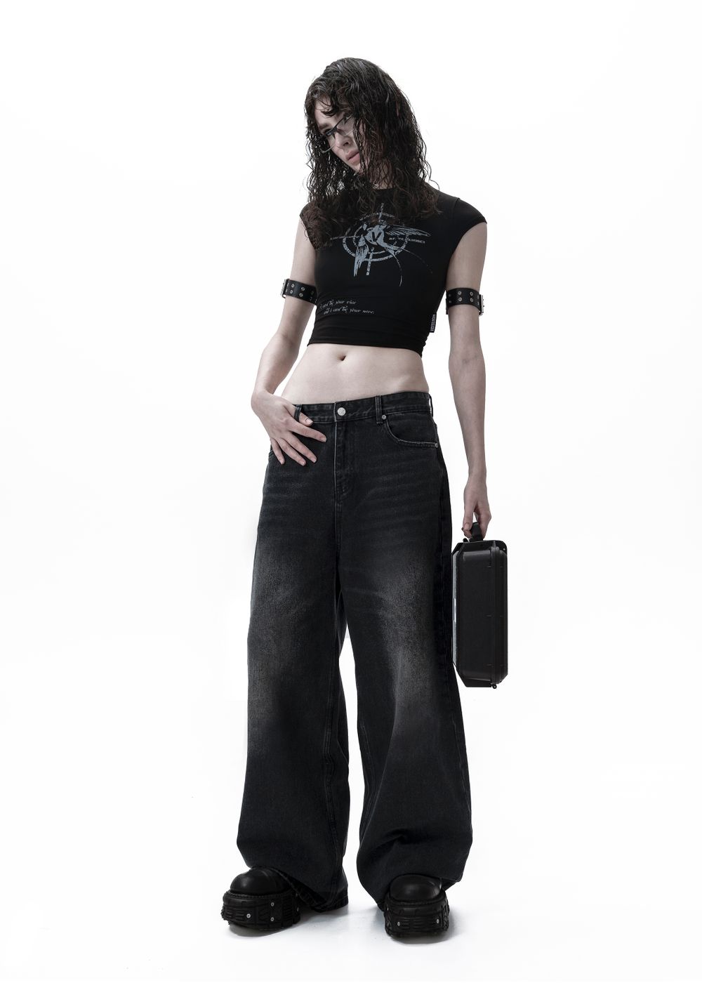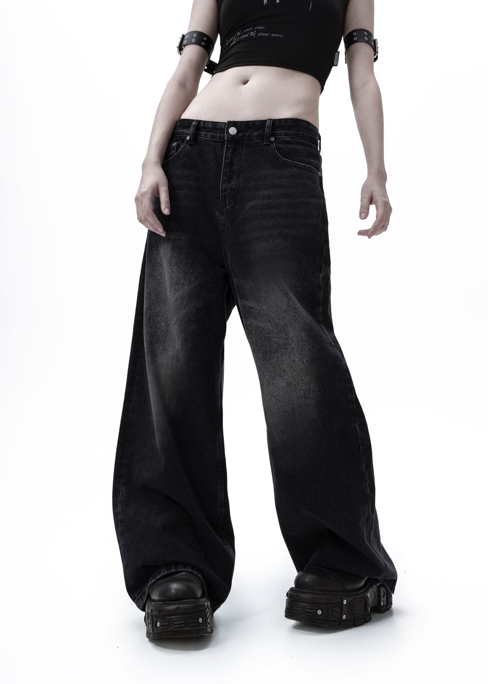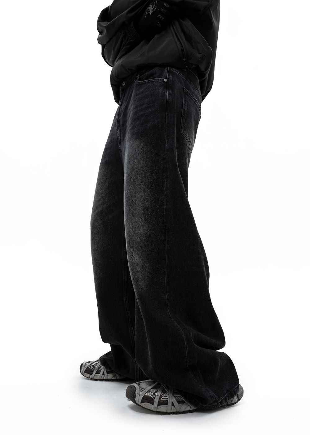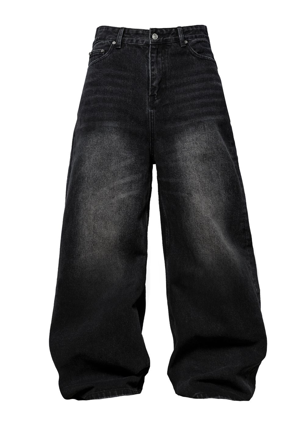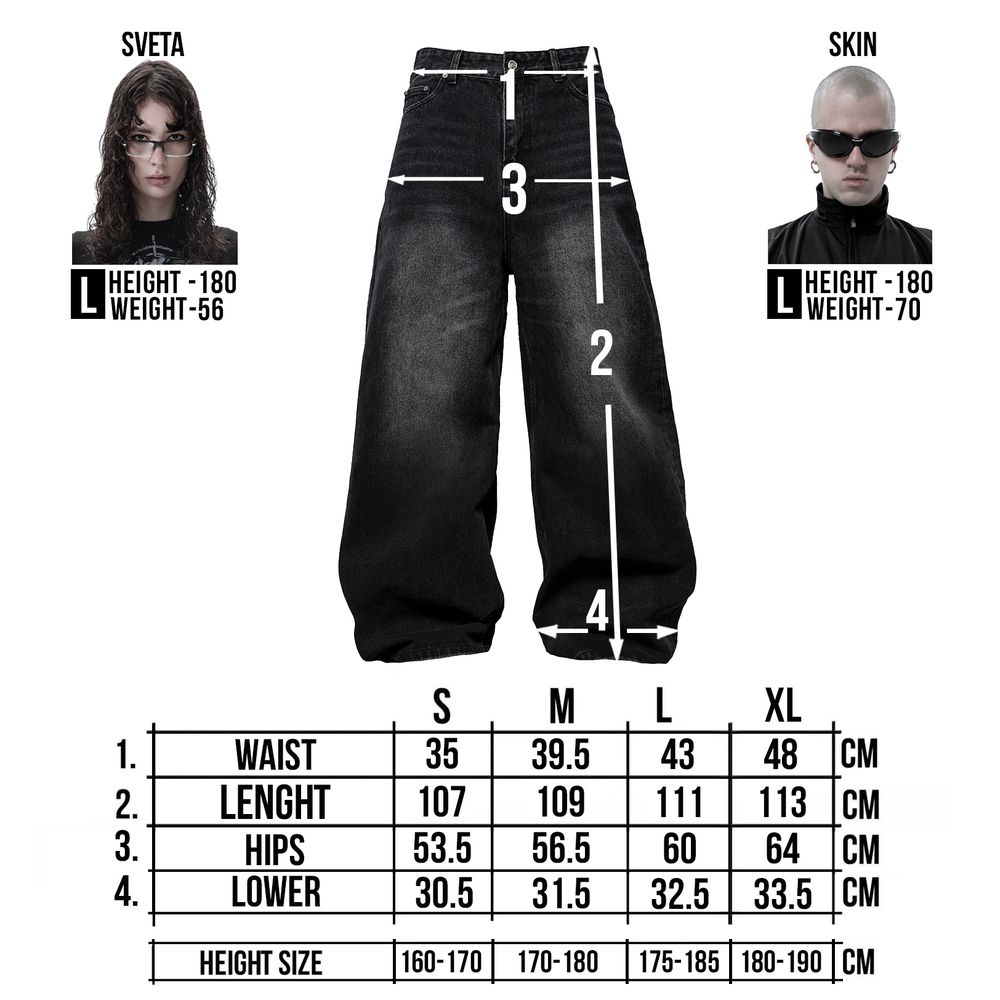 Straight oversized fit. Cracked logo print on the back pocket. Durable YKK zipper, branded iron button with engraved logo. Branded metal rivets reinforced along pocket seams. Leather jacron in a rich red color on the waistband.