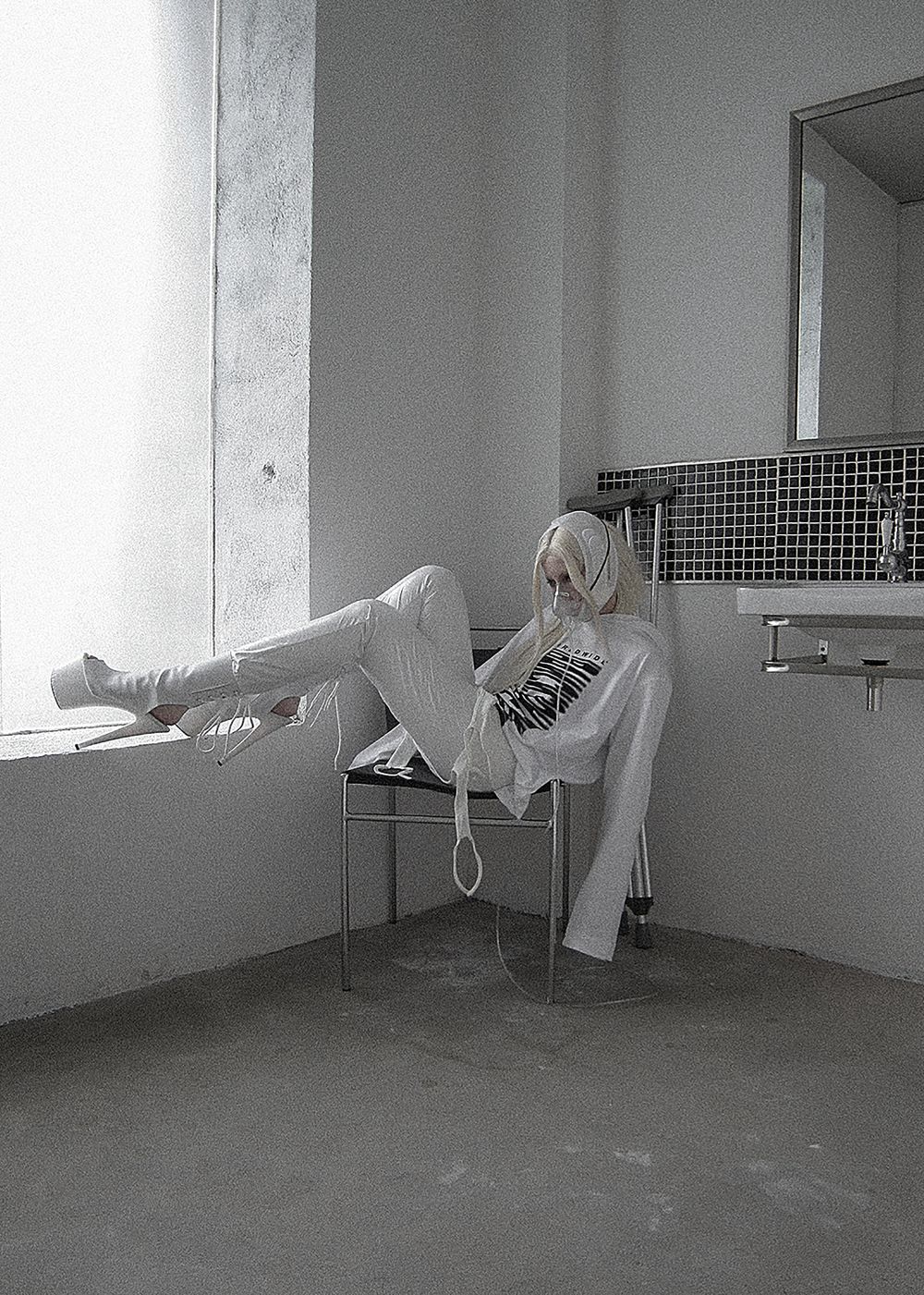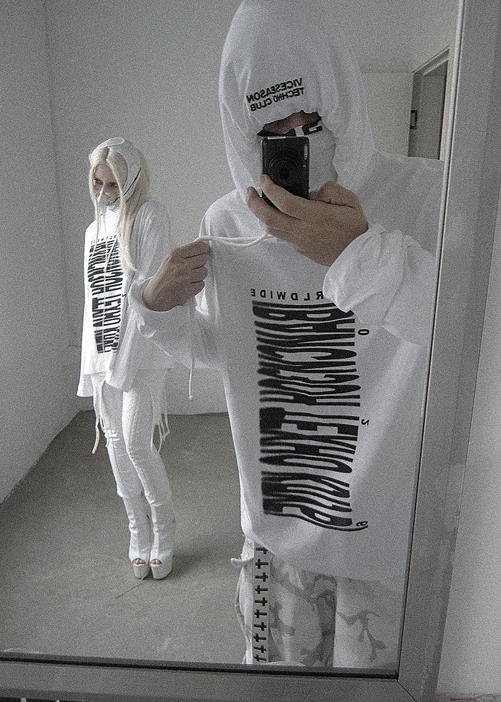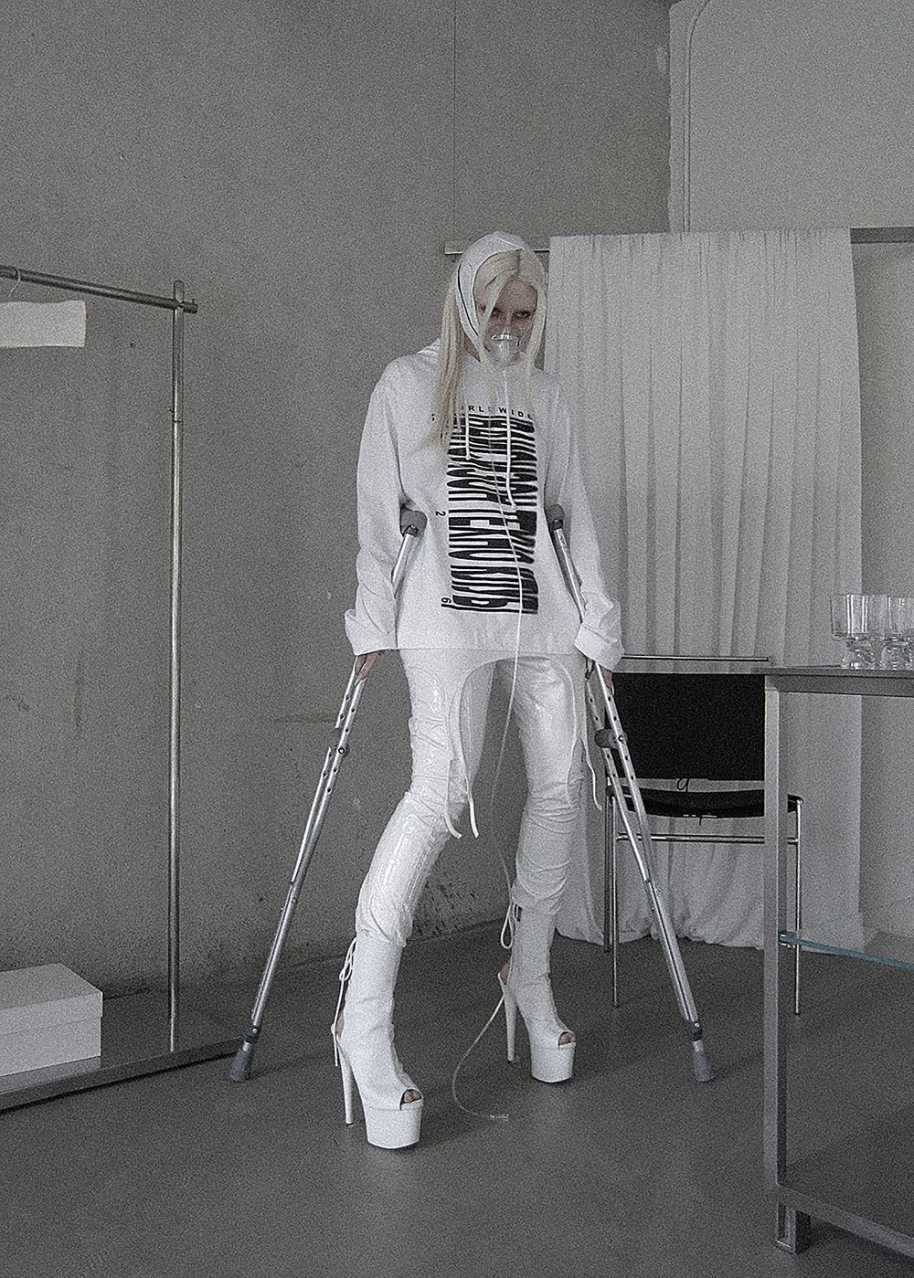 The print is inspired by the 2000s club fashion. A barcode, but not for scanning. Not a code for entry — but a symbol of its absence.