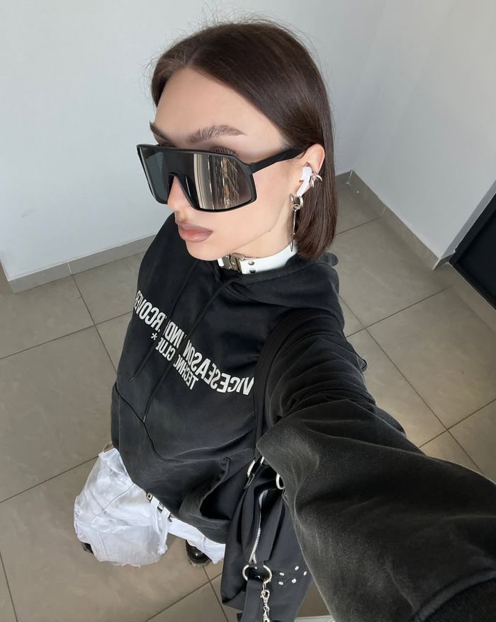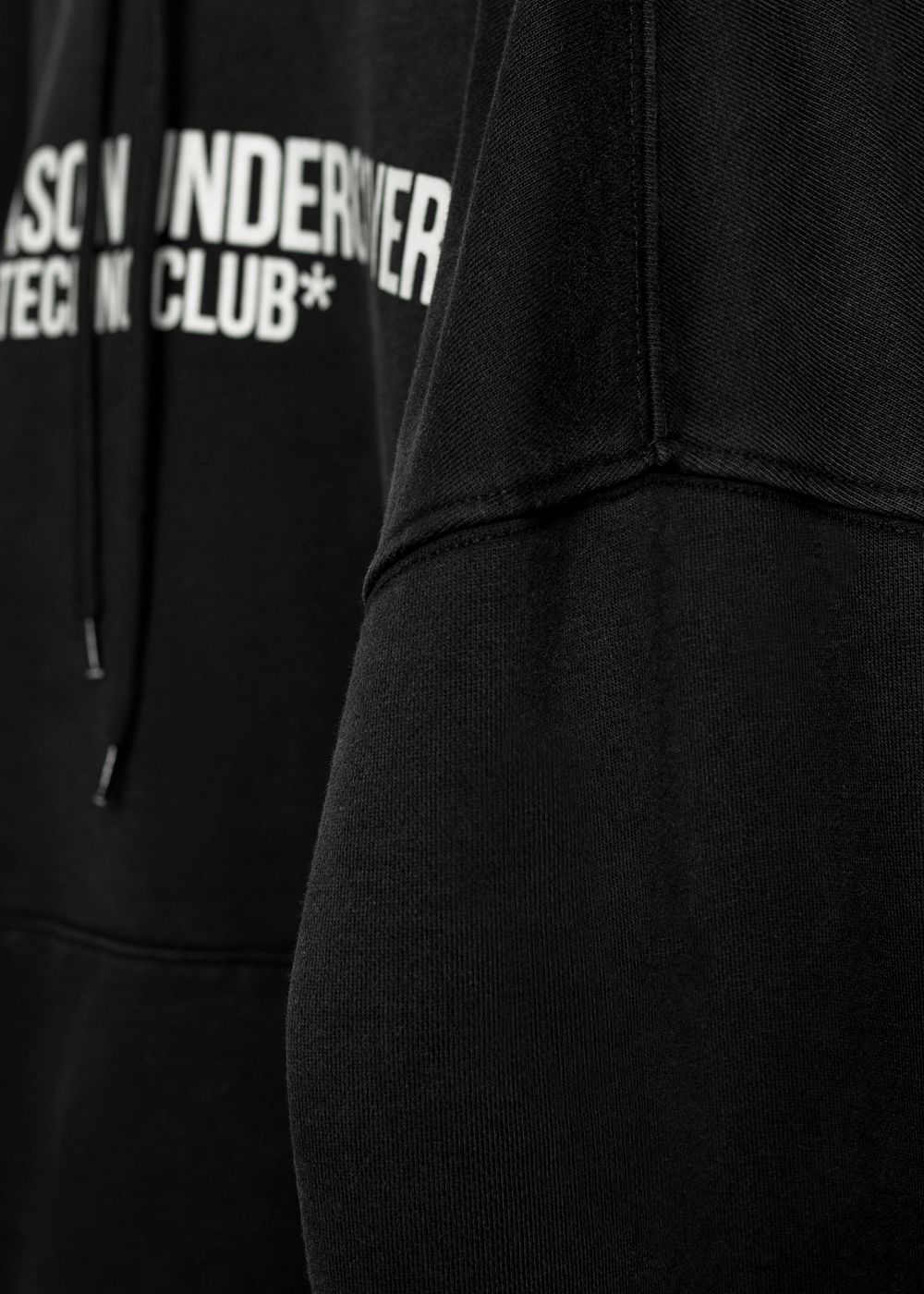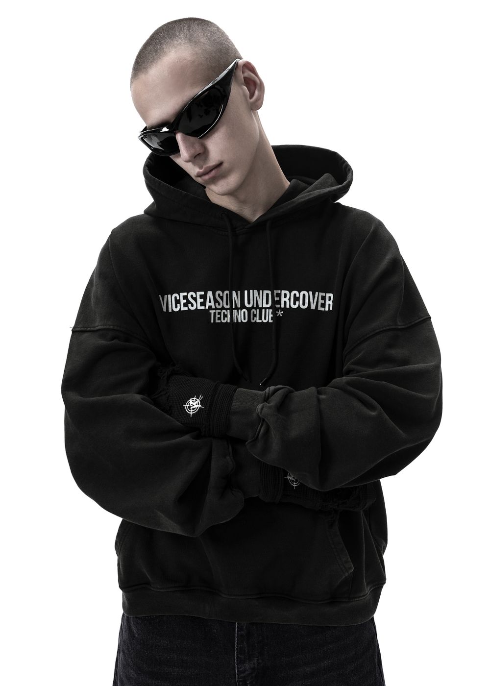 This hoodie is part of the "Techno Club" line and features a tag in the form of a keychain with the brand's bank card and a branded floppy disk.